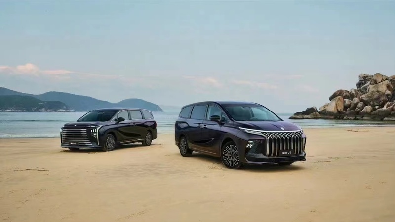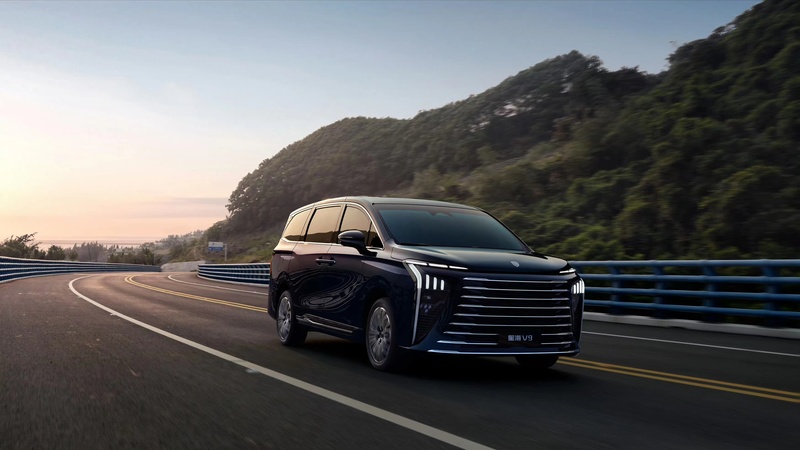 车尾采用贯穿式尾灯设计,搭配上方大尺寸扰流板,整体造型大气稳重。新车采用19寸星芒大轮毂,悬浮式车顶,隐藏式电动侧滑门。新车长宽高分别为5251×1920×1820mm,轴距为3018mm,整体造型方正大气。