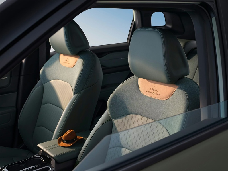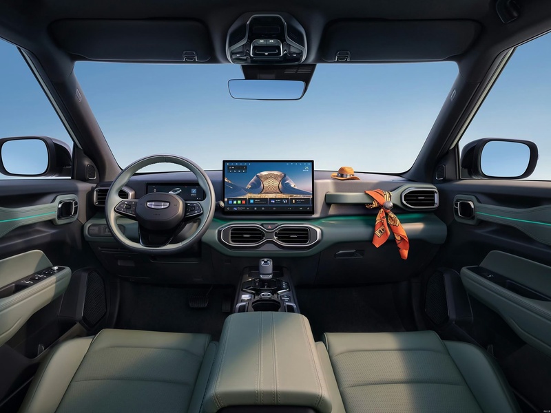 内饰方面,吉利牛仔配备8.8英寸全液晶仪表盘和14.6英寸悬浮中控屏,搭载Flyme Auto智能座舱系统。Flyme Link、HiCar、CarLink、高德地图等多种功能,增强车内人机交互的便捷性。提供仙踪绿、矿野灰两款内饰配色。配备256色呼吸氛围灯、全景天幕等。座椅采用拼接牛仔布材质,全系标配主驾6向电动调节功能,第二排座椅支持灵活调节。
