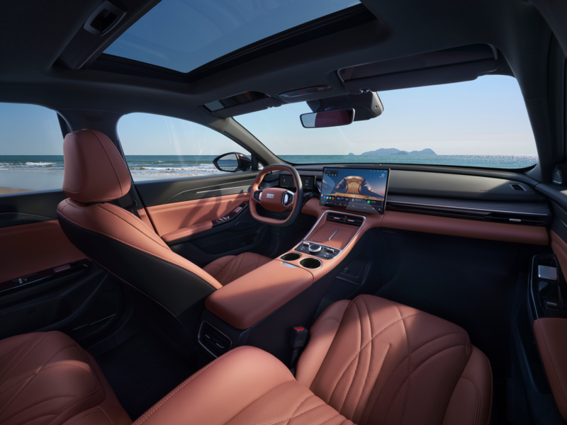 内饰方面,银河L6EM-i搭配10.2英寸全液晶仪表和14.6英寸中控大屏,全系搭载Flyme Auto车机系统,带来丰富的智能配置。支持双音区智能语音交互、全域OTA升级、手机APP远程控制等功能。保留了部分物理按键和旋钮,操作更加直观、便捷。内饰配色方面拥有暖棕色和深灰色。新车拥有50W无线充电、智能香氛系统功能。