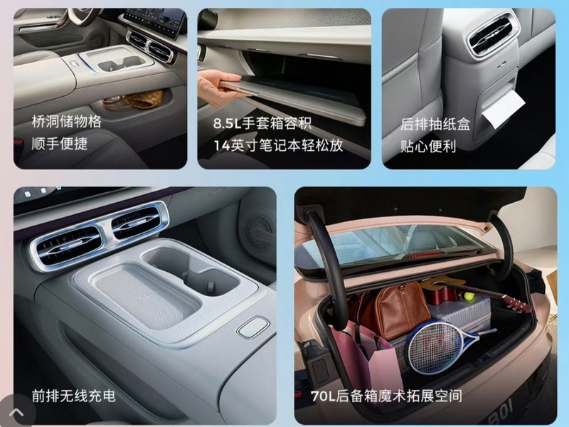 空间方面,零跑B01整车提供26个储物空间,沿用B系列首创百变副驾空间设计,后备箱容积为460L,采用上下可调隔板设计,**可拓展近70L,满足日常及出行载物所需。副驾驶通过6个魔术拓展孔和1个矩形凹槽,可自由组合折叠桌板、手机支架、储物盒、水杯架、挂饰等配件。座椅采用竹炭纤维面料,后排座椅靠背为28°黄金角度,支持6:4比例放倒,大大提升了乘坐舒适性与空间灵活性。